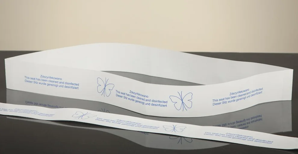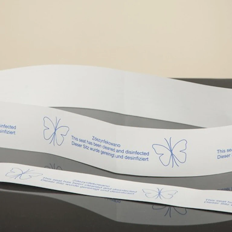 Pasek informacyjny na WC "ZDEZYNFEKOWANO" do założenia po zakończonym czyszczeniu i dezynfekcji toalety. 100 sztuk w kartonie.