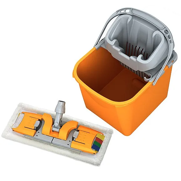 Wiadro w pomarańczowym kolorze o pojemności 20 l z szarą wyciskarką do mopów płaskich.