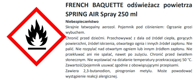 Zwroty wskazujące rodzaj zagrożenia: H222 Skrajnie łatwopalny aerozol.